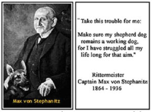 กัปตัน แม็กซ์ ยังเป็นผู้ก่อตั้งสมาคมเยอรมันเชพเพิร์ด หรือที่รู้จักกันในชื่อ SV (Verein für deutsche Schäferhunde) เขาดำรงตำแหน่งนายกสมาคมคนแรก และเป็นกำลังหลักในการผลักดันให้เกิดการขยายพันธุ์สุนัขใช้งานขึ้น สุนัขตัวแรกที่ได้จดทะเบียน คือ Hektor เป็นสุนัขที่มีลักษณะตรงกับความต้องการของกัปตันแม็กซ์ทุกประการ ต่อมาสุนัขตัวนี้ได้รับการเปลี่ยนชื่อเป็น Horand Von Grafrath and Von Stephanitz และเป็นต้นสายของสุนัขเยอรมันเชพเพิร์ดใช้งานชื่อดังหลายตัว เช่น Hector Roland เป็นต้น ในช่วงแรกงานหลักของสุนัขพันธุ์นี้จะเป็นงานด้านปศุสัตว์ ทำหน้าที่ไล่ต้อนฝูงสัตว์ให้แก่เกษตรกร ต่อมาในช่วงสงครามโลกครั้งที่ 1 สุนัขเยอรมันเชพเพิร์ด ถูกนำไปใช้ทางด้านทหารมากขึ้น