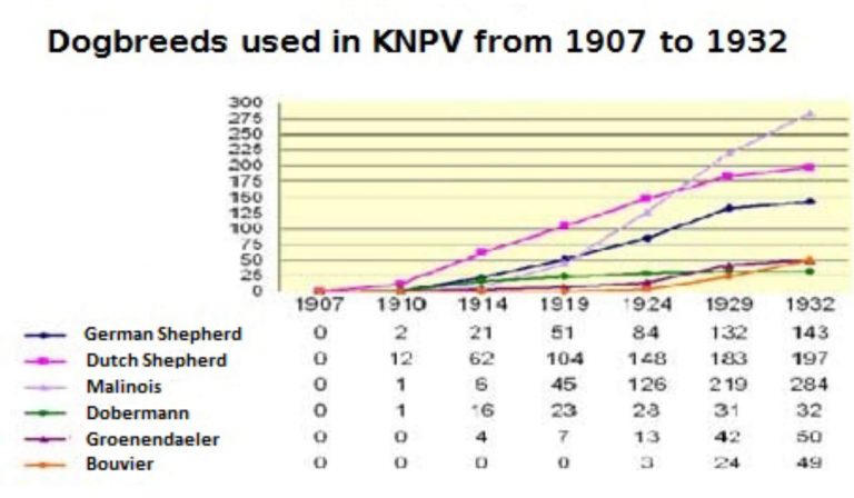 สาเหตุที่เยอรมันเชพเพิร์ดเป็นที่นิยมในขณะนั้นเพราะเป็นสายพันธุ์ที่หาได้ค่อนข้างง่าย นอกจากเยอรมันเชพเพิร์ดแล้ว ดัชเชพเพิร์ดยังเป็นอีกสายพันธุ์ที่นิยมในการฝึกสุนัข KNPVอย่างไรก็ตามจะเห็นได้ว่าความนิยมของ เบลเยี่ยม มาลินอยส์ได้แซงขึ้นมาเนื่องจากดัชเชพเพิร์ดสี Fawn ไม่นับเป็นมาตรฐานสายพันธุ์ตามข้อกำหนดของ FCIในค.ศ. 1914 ทำให้จำนวนของดัชเชพเพิร์ดลดลงอย่างรวดเร็วแต่ลักษณะสายพันธุ์ที่ไม่เป็นที่ยอมรับของดัชเชพเพิร์ดกลับถูกยอมรับในสายพันธุ์เบลเยี่ยม มาลีนอยส์ จึงเป็นข้ออธิบายของสาเหตุการเพิ่มความนิยมของมาลินอยส์นอกจากนั้นสายพันธุ์ผสมกลับเป็นที่นิยมมากขึ้น เนื่องจากการจดทะเบียนกับ FC ต้องเสียค่าธรรมเนียม ทำให้ผู้คนที่มุ่งเน้นการฝึกสุนัขใช้งาน (Title of working dog) จึงหันไปนิยมเลี้ยงสายพันธุ์ผสมมากกว่า